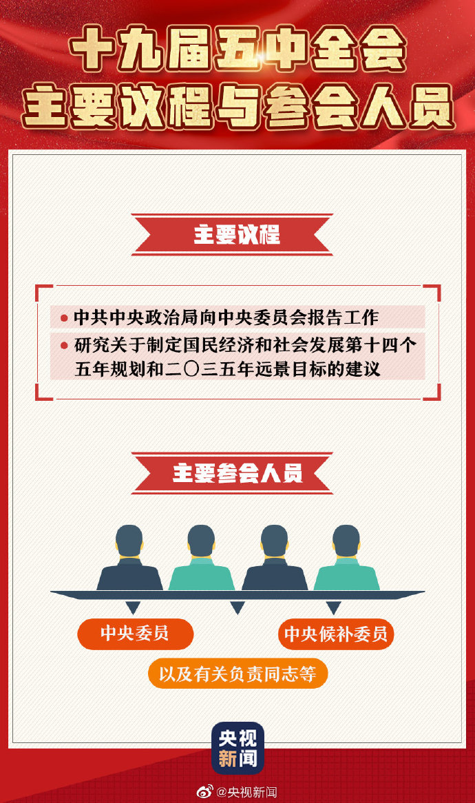 中國共產黨第十九屆中央委員會第五次全體會議,于10月26日至29日在北京舉行。主要議程是,中共中央政治局向中央委員會報告工作,研究關于制定國民經濟和社會發展第十四個五年規劃和二〇三五年遠景目標的建議。今天,一組圖帶你了解十九屆五中全會↓↓