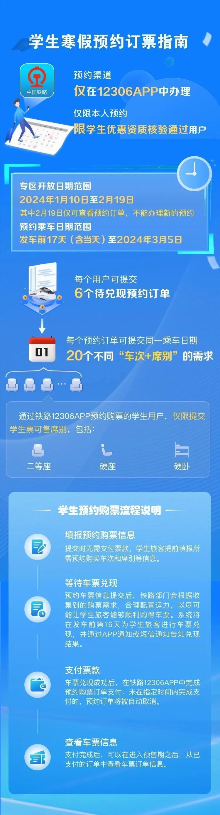 鐵路12306科創(chuàng)中心相關(guān)負(fù)責(zé)人介紹,為認(rèn)真貫徹落實(shí)黨中央國(guó)務(wù)院關(guān)于做好2024年元旦春節(jié)期間有關(guān)工作的要求,保障學(xué)生、務(wù)工人員等重點(diǎn)群體春運(yùn)出行,鐵路12306創(chuàng)新服務(wù)舉措,為學(xué)生、務(wù)工人員推出了售票服務(wù)專區(qū)。自1月10日起,符合條件的學(xué)生旅客(已通過學(xué)生優(yōu)惠資質(zhì)核驗(yàn)且有剩余優(yōu)惠乘車次數(shù))可通過“學(xué)生寒假訂票專項(xiàng)服務(wù)”專區(qū)預(yù)約購(gòu)買春運(yùn)期間(1月26日至3月5日)火車票,每名旅客最多可同時(shí)提交6個(gè)預(yù)約訂單,每個(gè)訂單可添加1個(gè)乘車日期的20個(gè)“車次+席別”的組合,可選席別為學(xué)生優(yōu)惠票適用的硬座、硬臥、二等座。已通過實(shí)名制核驗(yàn)的務(wù)工人員可通過“務(wù)工人員春運(yùn)預(yù)約訂票服務(wù)”專區(qū)預(yù)約購(gòu)買春運(yùn)期間火車票,每名旅客可同時(shí)提交6個(gè)預(yù)約訂單,每個(gè)訂單可選擇“時(shí)間+車次+席別”的1個(gè)組合。