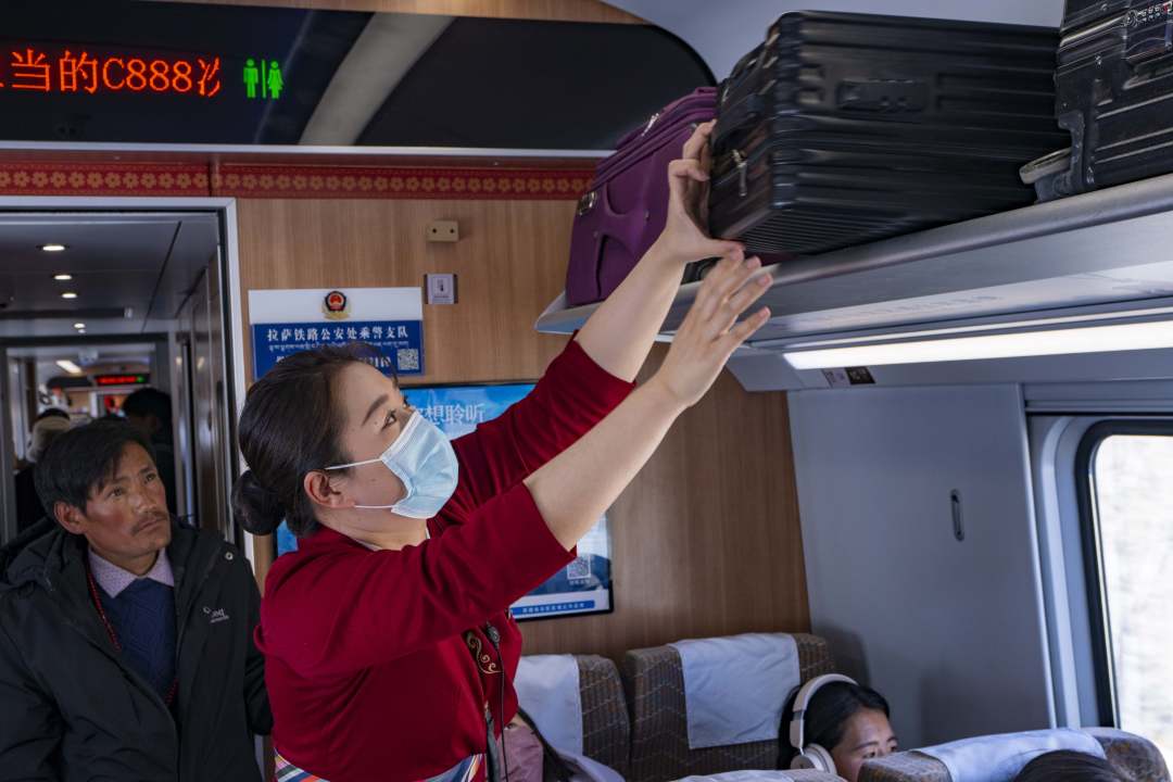 “這兩天列車都是超員狀態,我負責的車廂是人數最多的車廂。”李丹說著沒停下手中的活,“列車員要有耐心,更要細心?!闭f話間她邊檢查旅客頭頂放著的行李。 隨著列車從拉薩站緩緩開出,李丹開始了列車服務——邊走邊觀察邊詢問,她細心地觀察著乘客的情況?!斑@兩天是節后返程高峰,我們車班針對旅客年齡、身份等不同特點,進行了歸納與分析,并根據不同群體的需求,整理溝通要點,收集服務案例,使我們的服務能更好地滿足不同旅客的需求?!崩畹ふf。 李丹介紹,早上7點到車站開始,她手里的工作就沒停過。車班4名工作人員早早就到了站臺接車,開始了出乘前的準備工作。今天值乘的列車共有來回兩趟。列車開出前,我們要對整個車廂進行一次詳細的檢查,消防設備、播音設備、衛生間等,每一處都要檢查得認真仔細,確保設備設施狀態良好。