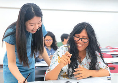 圖為在秘魯利馬,秘魯天主教大學孔子學院中文教師梁卿(左)輔導秘魯學生寫書法。
