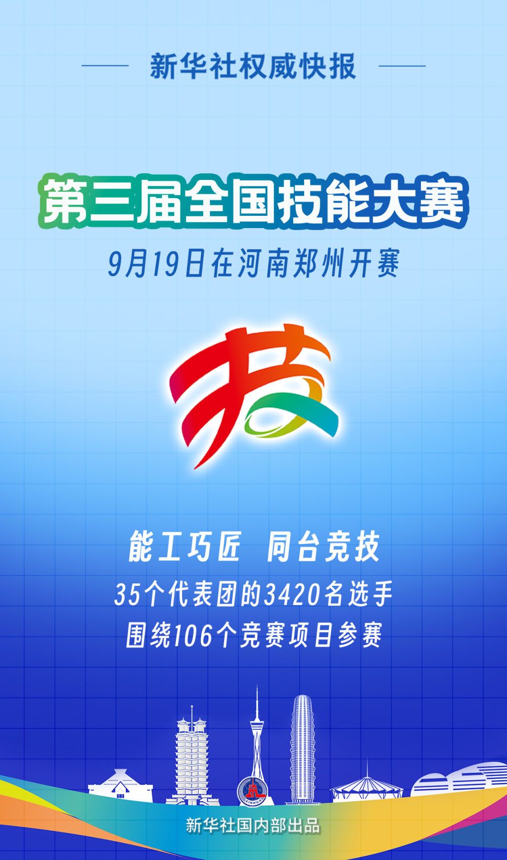 第三屆全國技能大賽9月19日在河南鄭州開賽,35個代表團的3420名選手圍繞106個競賽項目參賽,賽事活動為期5天。