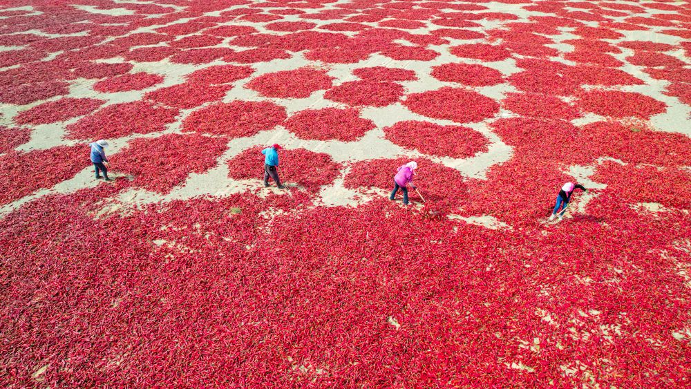 ↑2025年9月20日,農民在甘肅省酒泉市肅州區三墩鎮晾曬紅辣椒。(無人機照片)CICPHOTO/曹紅祖 攝