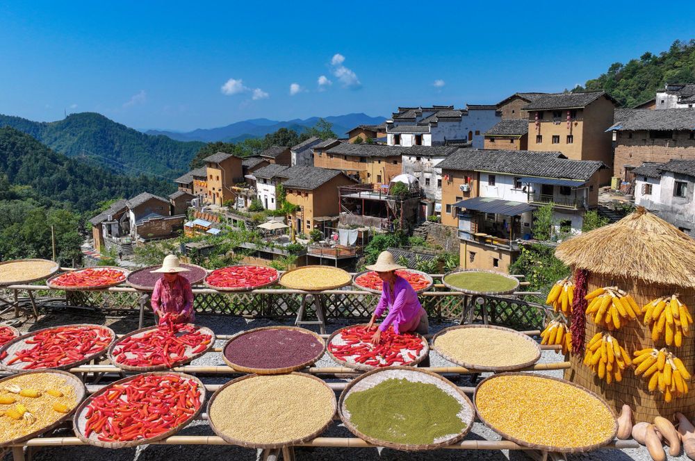 ↑2025年9月17日,農民在安徽省黃山市歙縣深渡鎮陽產村晾曬稻谷、玉米、南瓜、紅辣椒等農作物。CICPHOTO/施亞磊 攝