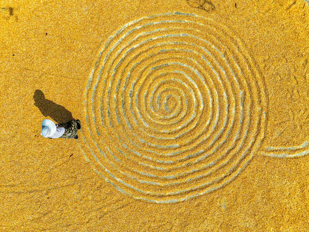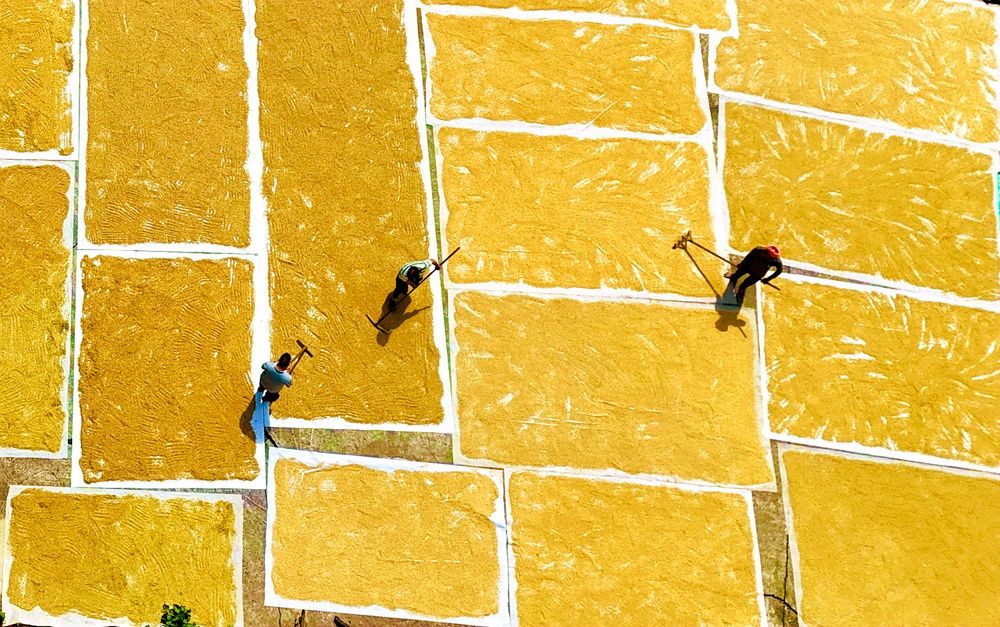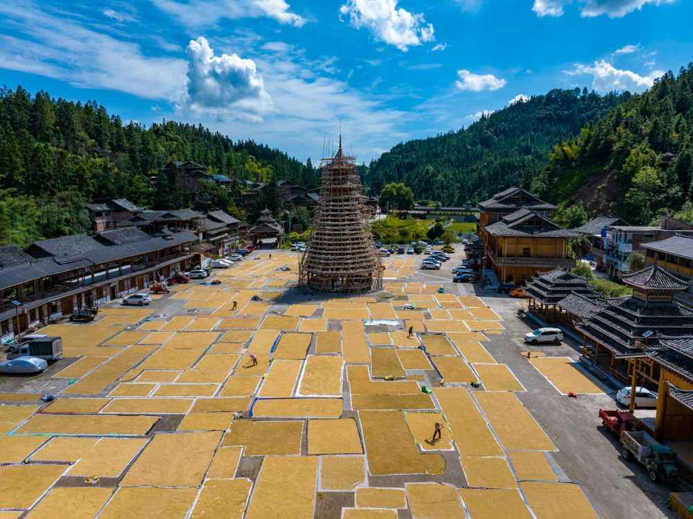 ↑2025年9月15日,農民在貴州省從江縣高增鄉小黃侗寨晾曬稻谷。(無人機照片)CICPHOTO/吳德軍 攝