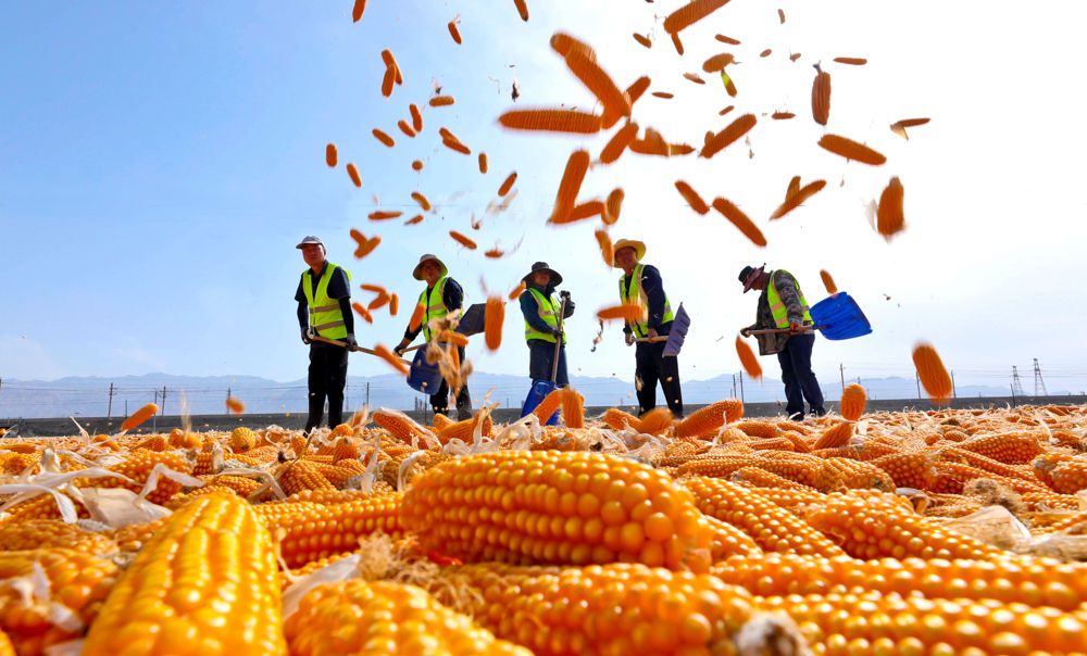 ↑2025年9月11日,工人在甘肅省張掖市高臺縣南華工業園區翻曬制種玉米。(無人機照片)CICPHOTO/王將 攝