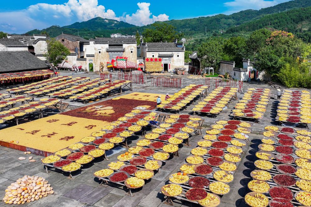 ↑2025年9月15日,農民在安徽省黃山市徽州區呈坎村晾曬稻谷、玉米、南瓜、紅辣椒、筍干等農作物。(無人機照片)CICPHOTO/潘禎祥 攝