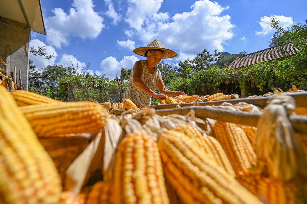 ↑2025年9月13日,農民在山東省青州市廟子鎮局子峪村晾曬玉米。CICPHOTO/王繼林 攝