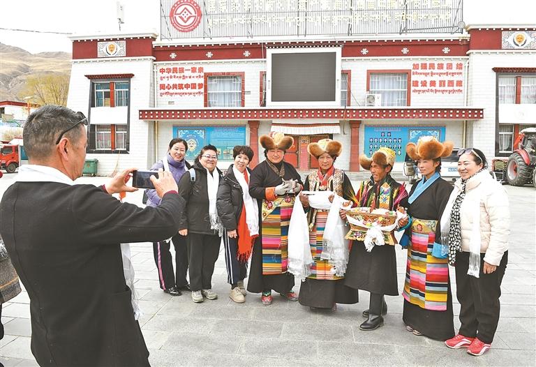 游客在山南市乃東區扎西曲登社區合照留念。