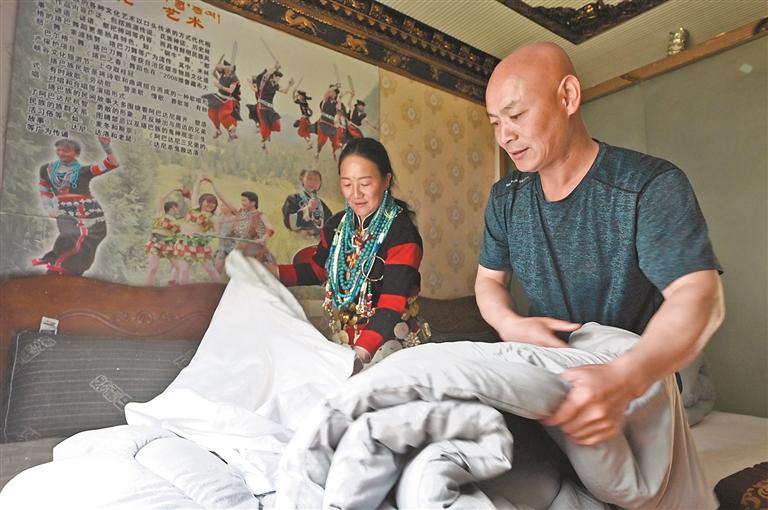 米林市南伊珞巴民族鄉,亞達兒與丈夫鄭定全在整理民宿房間。記者 白瑪澤旺 攝