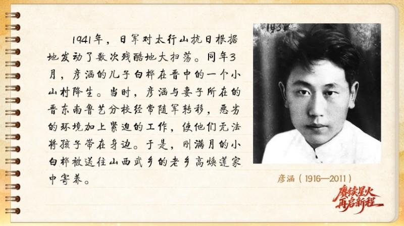 1941年,日軍對太行山抗日根據地發動了數次殘酷地大掃蕩。同年3月,彥涵的兒子白樺在晉中的一個小山村降生。當時,彥涵與妻子所在的晉東南魯藝分校經常隨軍轉移,惡劣的環境加上緊迫的工作,使他們無法將孩子帶在身邊。于是,剛滿月的小白樺被送往山西武鄉的老鄉高煥蓮家中寄養。