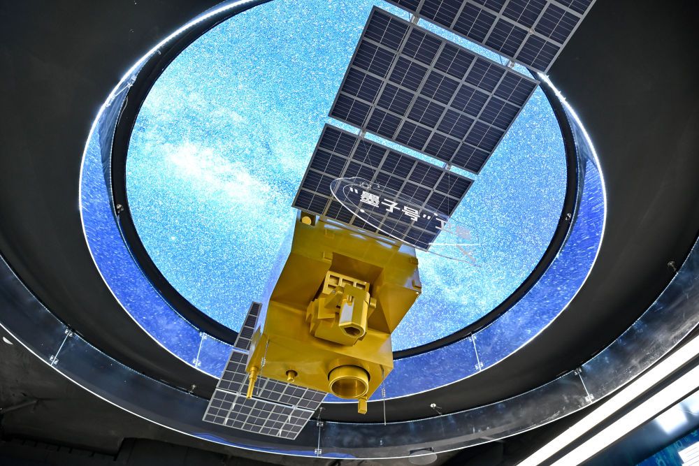 在位于安徽省合肥市的中電信量子信息科技集團有限公司科技體驗館內(nèi)拍攝的“墨子號”量子衛(wèi)星模型(2025年7月1日攝)。新華社記者 張鋮 攝