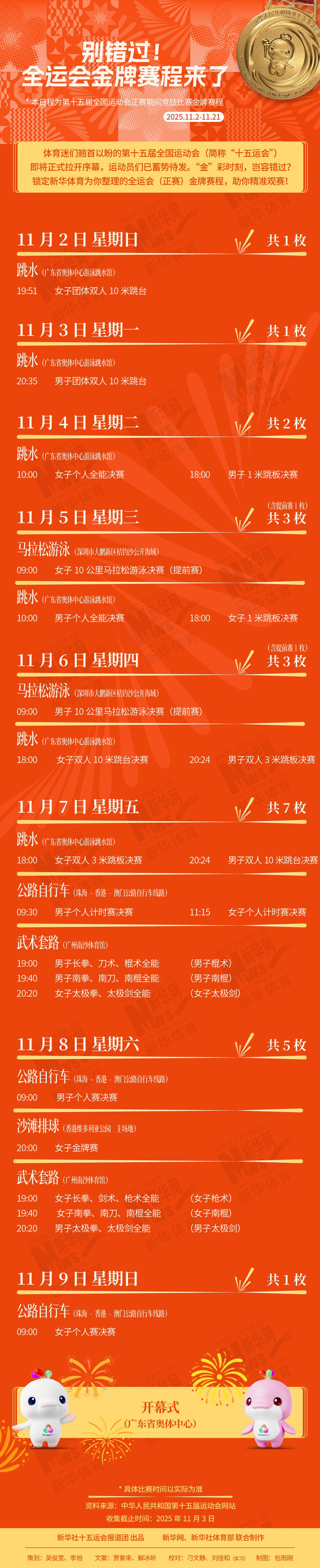體育迷們翹首以盼的第十五屆全國運動會(簡稱“十五運會”)即將正式拉開序幕,運動員們已蓄勢待發。“金”彩時刻,豈容錯過?鎖定新華體育為你整理的全運會(正賽)金牌賽程,助你精準觀賽!