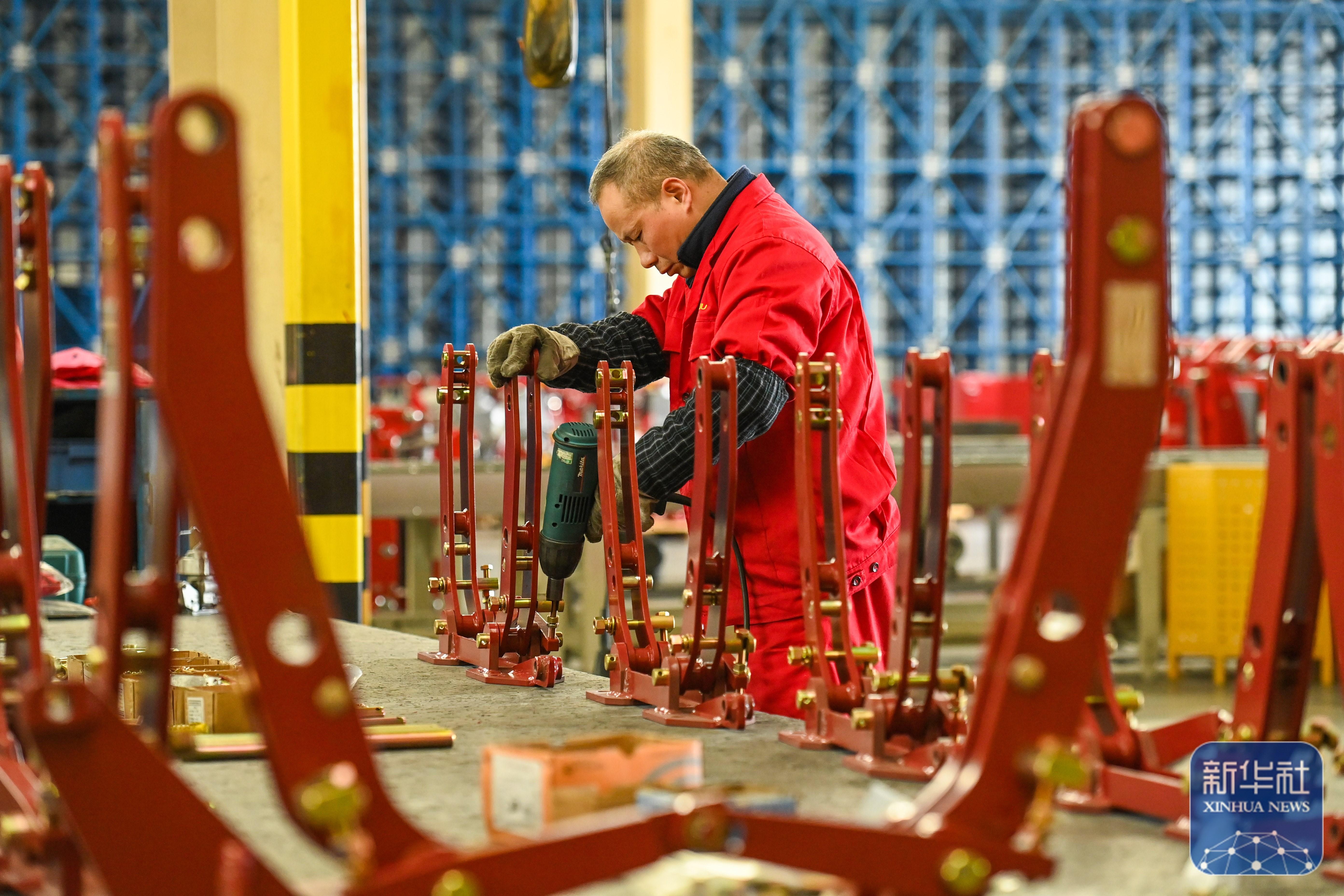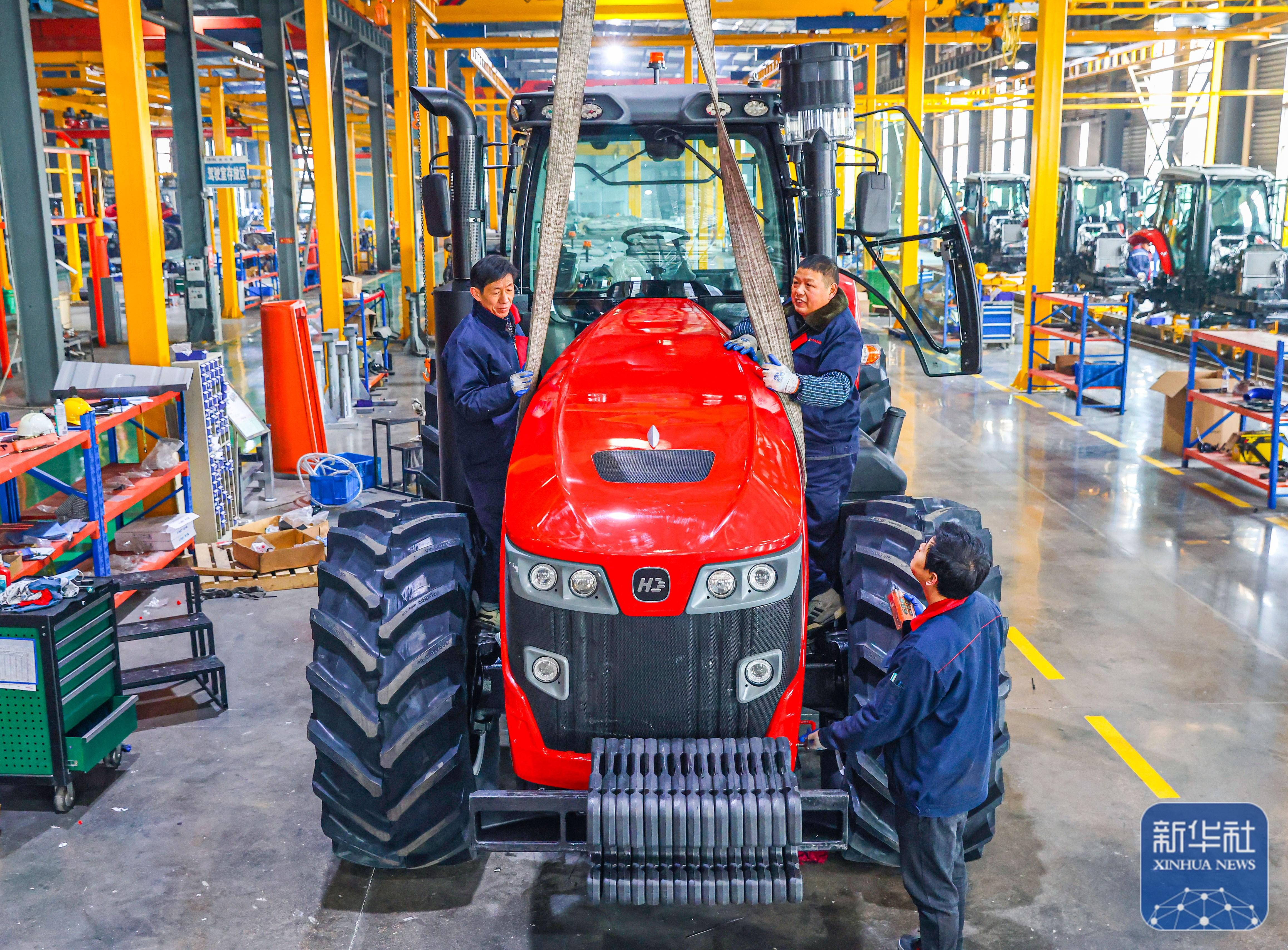↑ 1月5日,在位于江蘇省揚州市的金世紀(江蘇)智能科技有限公司,工人在大馬力全動力換擋智能拖拉機生產線上作業。新華社發(任飛攝)