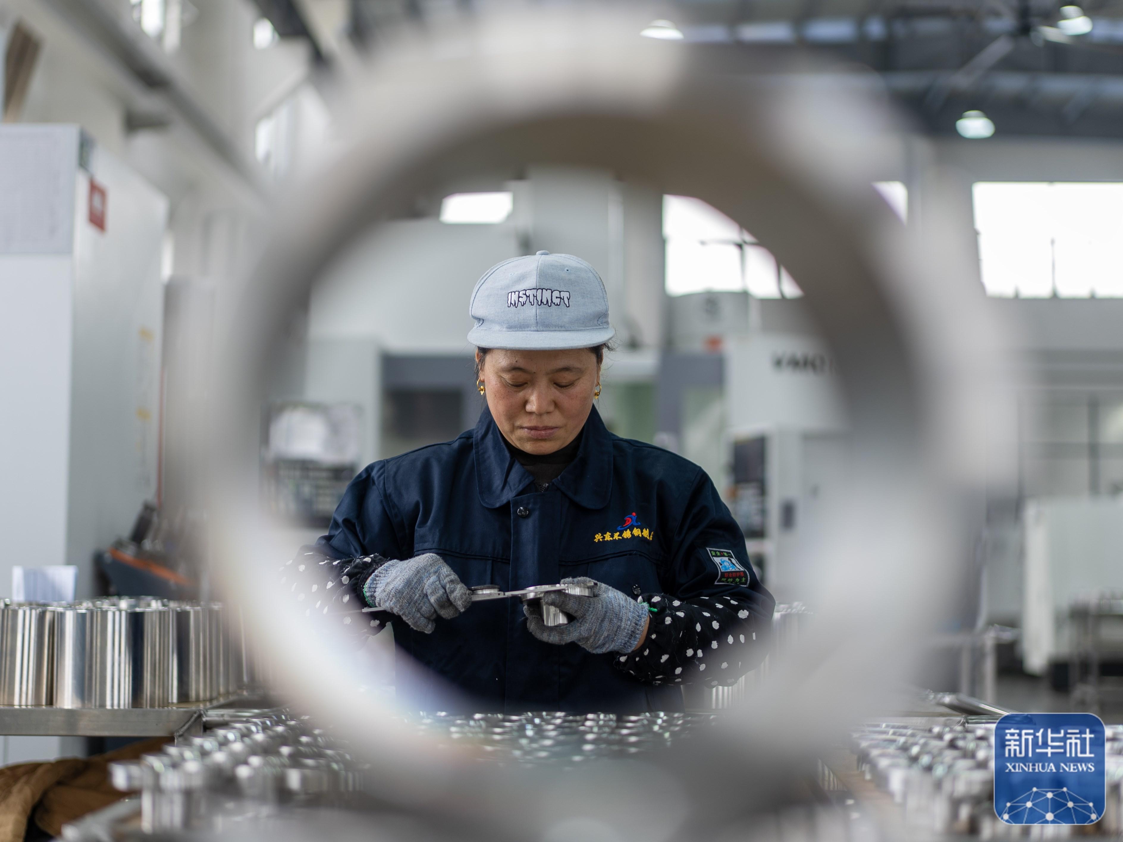 ↑ 1月5日,工人在位于江蘇省興化市戴南鎮的江蘇唐劉興東不銹鋼有限公司生產車間檢測產品。新華社發(周社根攝)