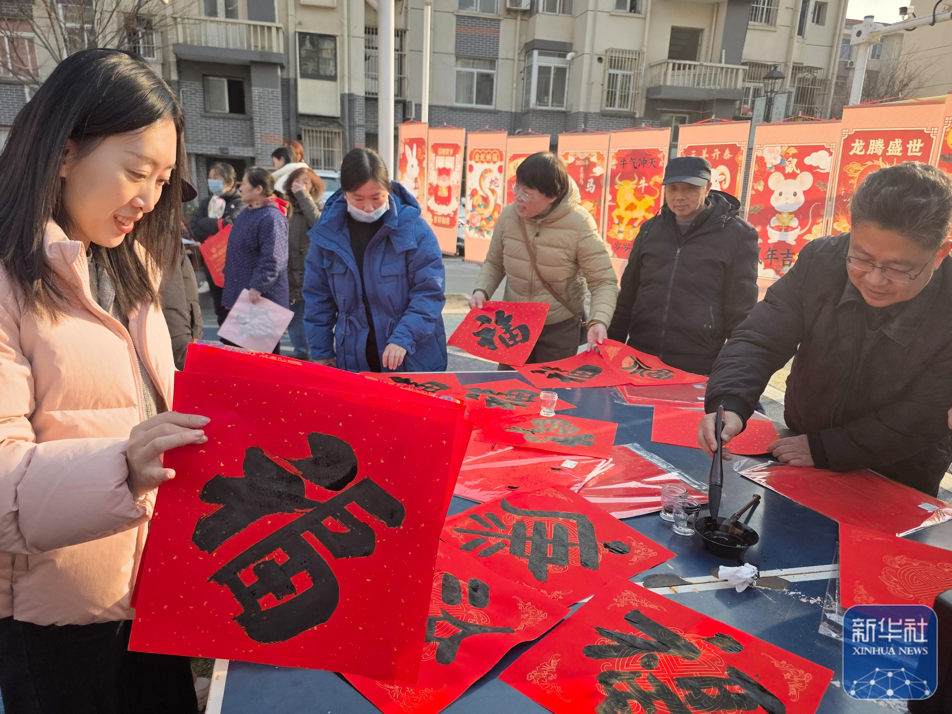 ↑1月23日,江蘇省南通市崇川區新城橋街道社區居民在新春公益集市現場領取福字。新華社發(許叢軍攝)
