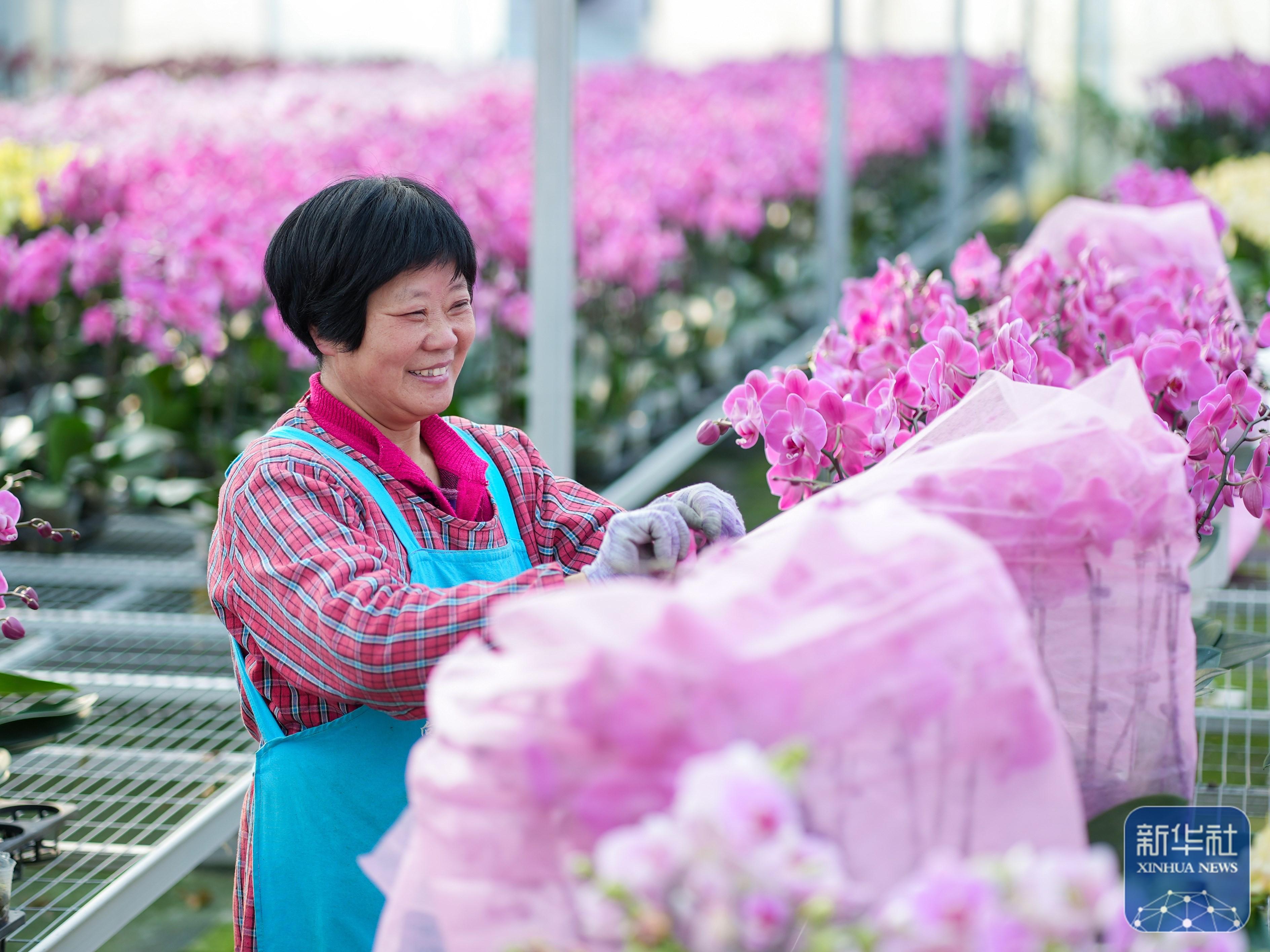 ↑1月23日,花卉工人在江蘇省泰州市姜堰區顧高鎮現代園藝產業園基地為花做造型,準備供應節日市場。新華社發(周社根攝)