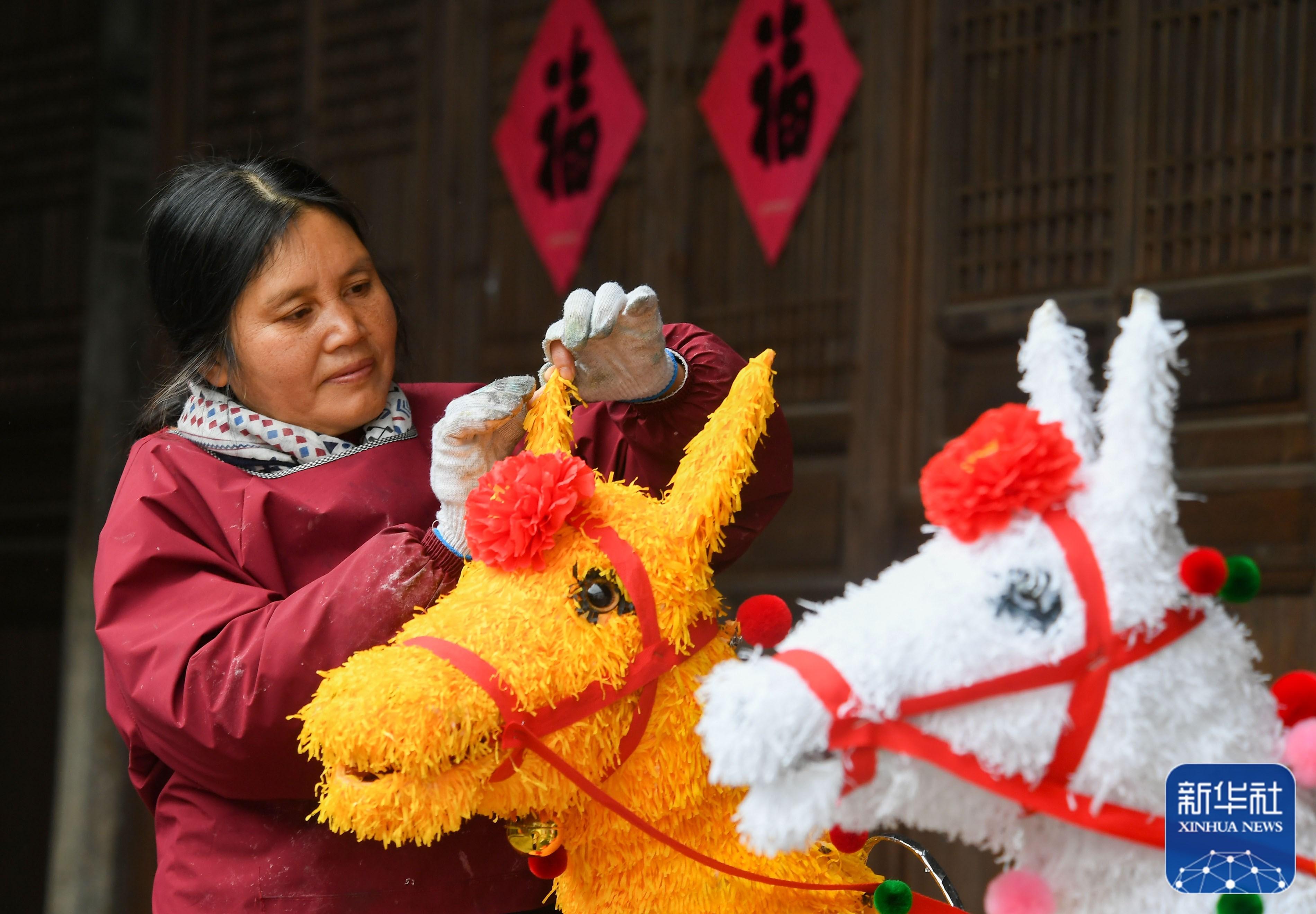 ↑ 1月21日,浙江省金華市浦江縣檀溪鎮潘周家村一古廳堂內,村民在制作擂馬燈。新華社發(時寬兵攝)