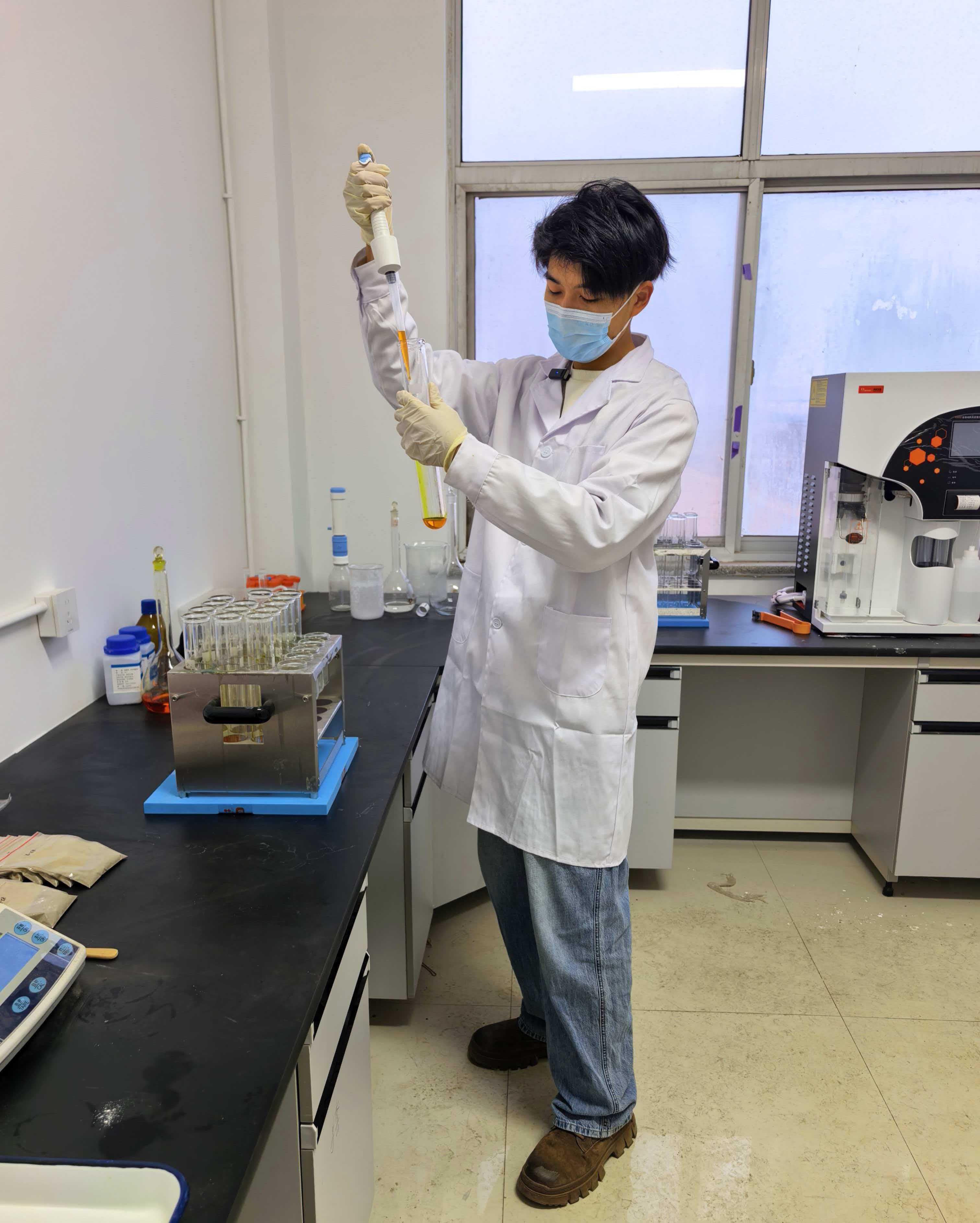中國(guó)農(nóng)業(yè)大學(xué)“白寨科技小院”研究生李康寧在實(shí)驗(yàn)室測(cè)量甜葉菊成分含量。農(nóng)民日?qǐng)?bào)全媒體記者 李杰 攝