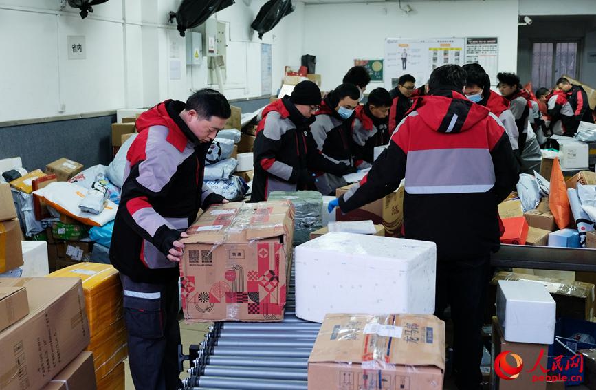 春節(jié)前包裹量攀升,任秀林認(rèn)真分揀、細(xì)致查驗(yàn),守護(hù)年貨安全。人民網(wǎng)記者 常力元攝