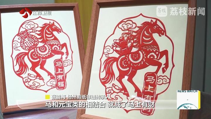 揚州剪紙非遺傳承人張震梅說:“馬和福字就是‘馬上有福’,馬和元寶類的相結(jié)合就成了‘馬上有財’。將我們揚州園林里面窗花的元素也包含在里面。 ”