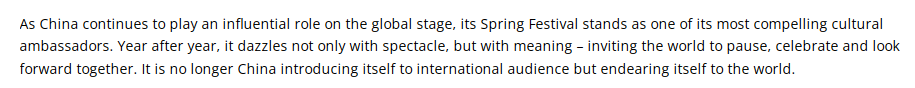 文章說,春節(jié)的精髓引發(fā)了全世界的共鳴,因為它提供了又一個增進交流的絕佳機會。春節(jié)所蘊含的團聚、和諧和希望等價值觀,深深打動了不同文化背景的人們。春節(jié)已被列入聯(lián)合國教科文組織人類非物質(zhì)文化遺產(chǎn)代表作名錄,因此,它不僅僅是一個中國的節(jié)日,而是全人類共同珍視的瑰寶。