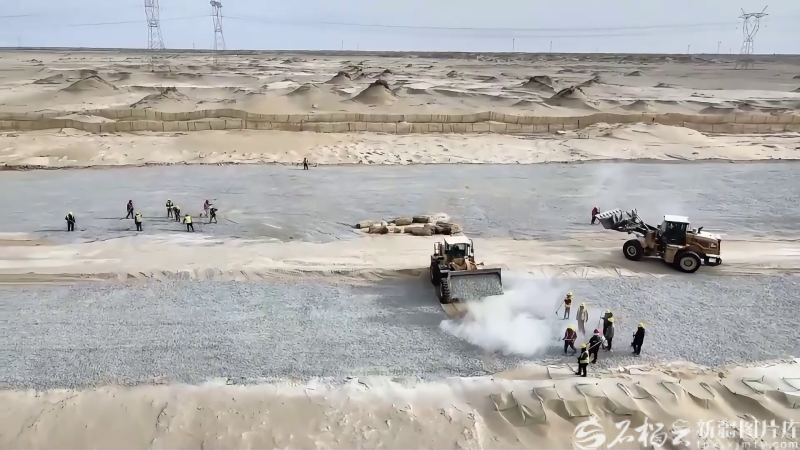 在“疆電外送”第四通道電源項目新能源部分生態治沙工程現場,建設者們在風沙中奮戰。巴音郭楞融媒體中心供圖