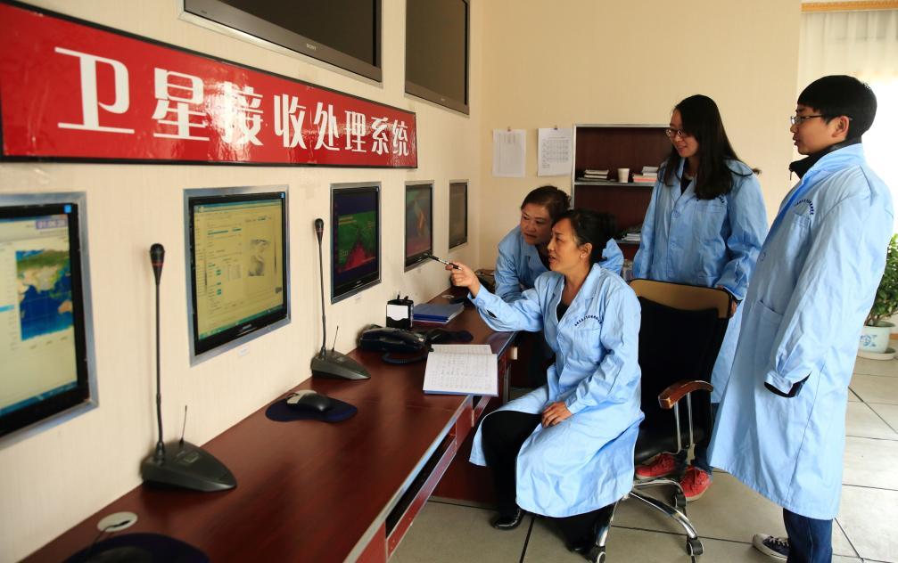 扎西央宗(左二)正在和同事探討遙感業務。(受訪單位供圖)