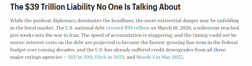 2026年3月18日,美國的國債規模首次突破39萬億美元大關,而這恰恰出現在對伊朗發動軍事行動的幾周之后。債務積累的速度令人震驚,而且時機也極為不利:預計未來幾十年,債務利息成本將成為美國聯邦預算中增長最快的項目,三大評級機構,標準普爾于 2011 年、惠譽于 2023 年、穆迪于 2025 年 5 月分別下調了美國的信用評級。