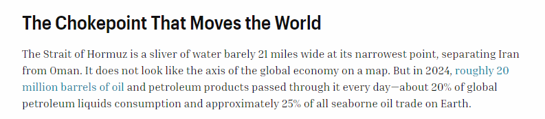 文章認為,霍爾木茲海峽是“石油美元”體系最關鍵的節點所在。作為全球能源運輸的“咽喉要道”,霍爾木茲海峽承擔了約20%的全球石油和近五分之一的液化天然氣(LNG)貿易運輸,對中東地區國家出口能源產品至關重要。