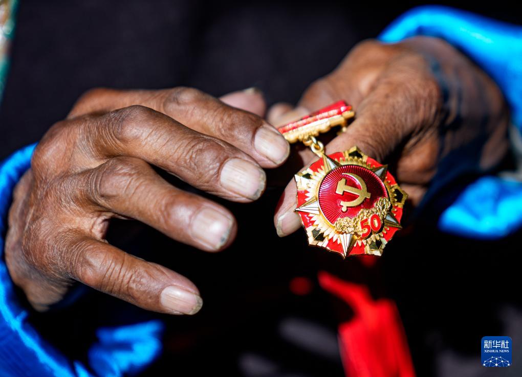 白瑪扎西在家中擦拭“光榮在黨50年”紀念章(3月26日攝)。
