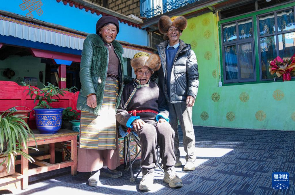 白瑪扎西(中)和女兒、女婿在家中合影(3月26日攝)。