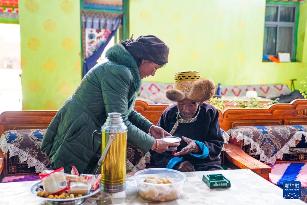 白瑪扎西(右)在家中喝酥油茶(3月26日攝)。