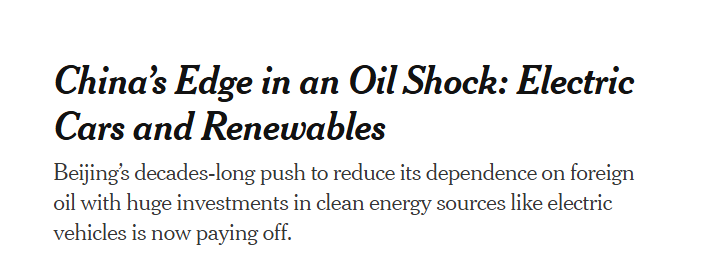面對中東戰(zhàn)事外溢沖擊全球能源市場這一議題,《紐約時報》近日報道指出,在全球主要工業(yè)國紛紛陷入能源焦慮之際,中國通過數(shù)十年來大力投資電動汽車和可再生能源,構建起真正意義上的能源抗壓屏障。