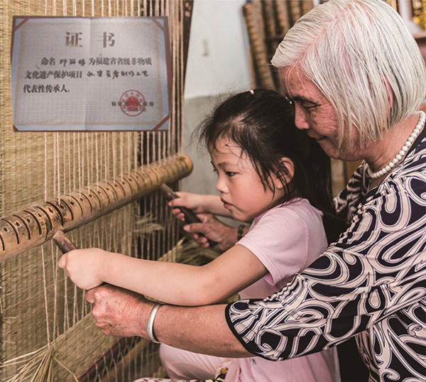 第一批省級非物質文化遺產項目代表性傳承人鄧麗娣教小孫女制作貢席。 永安融媒體中心供圖 永安市貢川古鎮流傳著一首民謠“延平枕頭掛口席,沙縣女兒不用挑。”延平即今南平,產藤制朱漆老式枕頭,童謠中的“掛口席”則是指貢川生產的草席。2008年, 貢川草席制作工藝被認定為福建省第二批非物質文化遺產保護項目。2015年“永安貢川草席”被評為地理標志證明商標。 貢川草席聞名遐邇,制作工藝歷史悠久。早在宋代,貢川草席就作為貢品進獻皇宮。明代中期,貢堡建立,水運發達,貢川成為永安四大集鎮之一,手工業和商業高度發展,貢席遂以其生產規模和優良品質暢銷八閩。 編席機貼墻而立,高一米、寬兩米的木框內上部橫架一條可上下活動的木梁,底部有一條固定的木梁。兩條木梁間緊繃的緯線,稱為綱。所有綱貫通一個橫著的竹筒,稱為扣。織貢席要先在扣上穿麻繩,1.8米寬的席子要穿73根麻繩。麻繩穿好后,再一根一根穿草。一張貢席制作下來,通常需要一天半到兩天時間。編織一床縱橫交錯、涇渭分明的貢席需要上下拉動木梁1000多次。