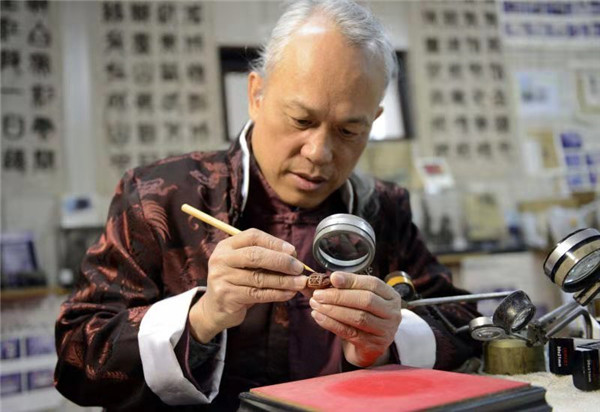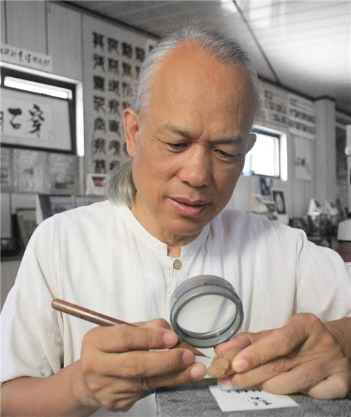 陳逢顯在雕刻。(資料圖片) 首屆中華文化與兩岸文創產業融合發展論壇日前在福州舉行。臺灣微雕藝術家陳逢顯攜欖核雕、米粒雕、金屬雕等微雕精品亮相同期舉辦的文創產品精品展,其中,世界上最小的“黃金小老鼠”系列作品尤為驚艷。只見6只黃金小老鼠齊聚在直徑3毫米的金元寶上,表情各異,栩栩如生。陳逢顯介紹說,這些純金雕刻的小老鼠尺寸僅1毫米左右,有“十全十美”“同心協力”等造型,“雕了6個月,失敗了上百次”。 毫厘之技 上世紀60年代初,陳逢顯與微雕結緣。當時還是小學三年級的他第一次參觀臺北故宮博物院,見到了清代雕刻家陳祖章的傳世之作——雕橄欖核舟。3.4厘米長的核舟桅帆繩索俱全,門窗開合自如。舟上,雕著8個神態動作各異的人物,有人手持書卷,有人正在船頭煮茶……舟底還有毫芒細刻《后赤壁賦》全文三百余字。方寸之間,就把蘇東坡游赤壁的景象描摹得活靈活現,讓人驚嘆不已。自幼愛好藝術的陳逢顯便許下心愿,要學習微雕這門中華傳統藝術。 知道陳逢顯的理想后,小學老師鼓勵他先練好書法,“老師說要把中華傳統文化發揚光大,得從基本功學起”。從此,篆書、隸書、行書……各種書法字體陳逢顯無不潛心臨摹鉆研,他還廣泛涉獵繪畫、雕塑等,為日后的藝術創作打下了堅實基礎。 1981年,陳逢顯進入臺灣印鈔廠,得以接觸到放大鏡、鋼針、微毛筆等基礎工具。每天手持鋼針雕刻貨幣雕版,日積月累,他便磨煉出精細的雕刻技巧和沉靜平和的耐心。 由于當時臺灣幾乎無人從事微雕事業,無師可拜的陳逢顯只能自行揣摩,這條路走得格外孤獨而艱辛。除了苦練手藝,他還到臺灣各大圖書館搜集文獻,了解微雕工法。 微雕最早見于中國的甲骨文,因為甲骨取得不易,因此不少甲骨文字都寫得很小,到了宋末才由畫工加以制作推廣,現在臺北故宮博物院中典藏的多寶格、象牙雕等也是微雕工藝頗具代表性的作品。臺北故宮博物院收藏有多枚欖核舟,方寸之間,可見中華傳統文化之博大。 十年一劍
