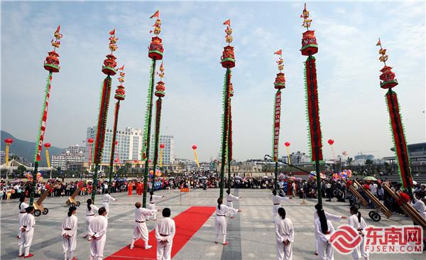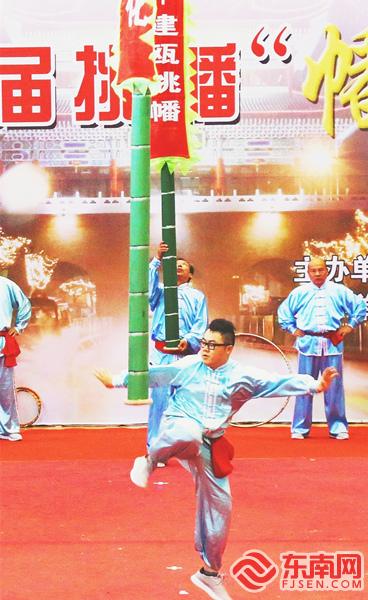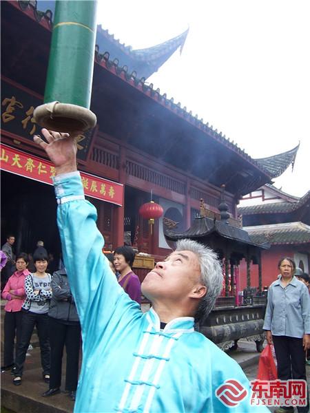 建甌挑幡經常應邀參加節慶活動表演。魏永青攝 一會兒將竹竿緊咬嘴中,一會兒玩轉手間,時而抬升時而墜落,時而靜止時而旋轉……9月23日上午,在2019“中國農民豐收節”全國70個現場直播點之一——浦城“中國農民豐收節”現場,一群表演藝人身著統一服飾,手持一根十余米長的竹竿,竿頂有裝飾,獨特又驚險刺激的表演引來觀眾的陣陣叫好。這便是被譽為“中華一絕,天下第一”的建甌挑幡!在建甌乃至閩北,或逢年過節,或大廟會,只要遇到喜慶的日子、高興的事,都能看到幡舞翩躚的景象。 高超的技藝、熱烈濃郁的鄉土風韻,讓建甌挑幡名揚海內外,中國上海大世界吉尼斯總部將其列入“吉尼斯大全”,2005年,建甌挑幡被列入福建省第一批省級非物質文化遺產代表作名錄;2008年,又被列入第一批國家級非物質文化遺產擴展項目名錄。作為有著300多年歷史的古老技藝,建甌挑幡歷經風雨,在一代代挑幡藝人的傳承和堅守下,日益煥發出勃勃生機。 陳泉成:“建甌挑幡第一人” 建甌挑幡始于明末,建寧府(今建甌)大洲造船的工匠應征入伍民族英雄鄭成功收復臺灣的隊伍。在收復臺灣后的農歷正月二十四,百姓為迎接凱旋的將士,設宴席唱戲,將士們則將帶回的軍旗捆在長竹竿頭,盡情揮舞,對壯烈捐軀的弟兄們寄以深深的懷念。以后每年均以此禮節告慰英烈,逐漸演化成當今建甌民間特有的挑幡習俗,世代相傳。