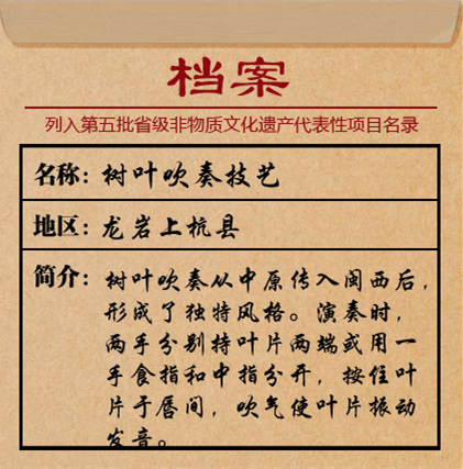 11月,省政府辦公廳印發(fā)《客家文化(閩西)生態(tài)保護(hù)區(qū)總體規(guī)劃》,文件確立了要加強(qiáng)挖掘、梳理和研究的客家優(yōu)秀傳統(tǒng)文化遺產(chǎn)項(xiàng)目,上杭的樹(shù)葉吹奏技藝赫然在列。此外,縣里還物色了一整層400多平米的空間,計(jì)劃將其打造成集辦公、培訓(xùn)為一體的樹(shù)葉吹奏展覽館。