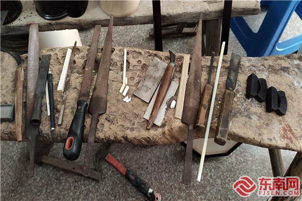 制作樂器的工具。東南網記者 楊超斌 攝 傳統手藝的傳承大多子承父業。如今,如何更好的發展莆仙傳統樂器制作技藝的重任落在了陳金福的兒子陳篙松肩上。 科班出身的陳篙松在大學畢業后選擇了回到父親的小店,背負起第七代傳承人的責任與使命,傳承和堅守這項“事業”,并希望利用自己學到的新知識、新理念讓莆仙傳統器樂煥發出新的光彩。 問及學成歸來,為何選擇這充滿著未知變數事業的緣由時,陳篙松顯得不以為意。“也許是習慣吧,從小就是在父親制作樂器的敲敲打打聲中長大,自己也在不斷學習制作。制作傳統樂器已經很自然地成為我生命中的一部分。這些傳統的東西挺寶貴的,感覺這么丟了就太可惜了”。 陳篙松告訴本網記者,莆仙傳統樂器最初的形式和種類是十分多樣的,但是隨著整個社會文化的發展,有些樂器越來越不被“需要”了。如莆仙戲中用于丑角出場時使用的笛管以及演出苦情戲時使用的文管,集拉彈于一身的文枕琴,做工精美的碗胡等,這些具有莆仙特色的傳統樂器的市場需求也越來越少,面臨著被“淘汰”的局面