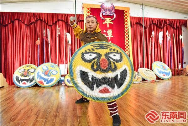 陳文英正在練習藤牌操 東南網記者 張哲昊 攝 走進平潭藤牌操傳承基地三樓陳列室,記者一下就被墻邊整齊擺放著的長槍、短刀、鹿角叉等兵器,以及造型各異的虎頭藤牌所吸引。 要靈活運用這些兵器與藤牌陣法并非易事。陳文英告訴記者,藤牌操訓練強度之大,讓不少學員望而卻步。“我這一批師兄弟,大部分人就是倒在了‘鴛鴦步’這招上。”他說,許多人扛不住,新鮮勁兒一過就紛紛退出了。 陳文英口中的“鴛鴦步”,正是藤牌操的精髓所在。這種步法以腿上功夫見長,要求練習者蹲下身子,降低身體重心,雙手擺好架勢,兩腿交叉快速前進,對體能要求極高。 現場,陳文英為記者演示了一遍“鴛鴦步”,只見他不僅步伐扎實穩健,還能一邊舉起武器與藤牌比劃,一邊與旁人交流,大氣不喘一口。“若能夠用此招行動自如,才能進而學習陣法。”他說。 這并非一朝一夕之功。為了練好藤牌操,陳文英白天在外務工,晚上才一頭扎進由石板條搭建的簡易訓練場練操,時常一練就是一整夜,直到將“蹲跳滾爬”四項基礎功夫完全掌握,方才出師,這花了他3年多的時間。 在他看來,學藤牌操門檻不算高,最要緊的是需勤練不輟。之后,陳文英逐漸成長為藤牌操傳人中的中流砥柱,常利用空閑時間義授藤牌操,在當地已積累了一定名氣,一年到頭要承接十數場演出。 可事與愿違,平潭藤牌操由盛再度轉衰,幾乎就是轉眼的事。 上世紀90年代末以來,藤牌操的觀眾逐年減少,老師傅相繼離世,其它藤牌手大多涌向外地謀生,而年輕一代卻不愿意接班。 更令人擔憂的是,藤牌操保留下的正宗套路僅余三分之一!若不加以保護,很有可能會上演“人亡藝絕”的悲劇,這讓陳文英的心里火急火燎。 “藤牌操是老祖宗留下的遺產,一定要守護好!”陳文英謹記師父的囑托,迫不及待地行動起來,開始了傳承藤牌操的“保衛戰”。 傳承:破除舊規,煥發新活力
