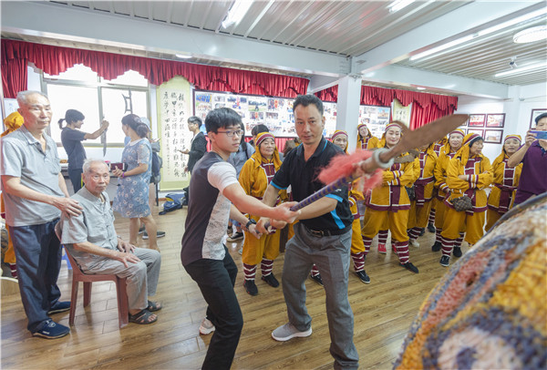 陳文英(左)與師兄張緯榮練習藤牌操 東南網記者 張哲昊 攝 今年55歲的陳文英正是陳錦和的曾孫,他說,自己家中世代傳承藤牌操,祖父陳阿命過去常在家中教導伯父陳輝生練習藤牌操,二人都是當地響當當的藤牌操手,他耳濡目染,對藤牌操產生了濃厚興趣。 可惜的是,“文革”期間,藤牌操所用兵器均被收繳,這項流傳了數百年的民間藝術逐漸消匿于田間地頭,傳承一度式微。直到上世紀80年代初,第三、四代傳人們一口氣招收了26名弟子,才慢慢恢復元氣,又重出“江湖”,重獲生機。 陳文英就是這批弟子其中之一。18歲起,他便師從伯父陳輝生,成為了平潭藤牌操第五代傳人。 陳文英回憶,每逢宗族祭祀、佳節慶典等場合,藤牌操一定是必備表演項目,圍觀群眾眾多,可以說是“萬人空巷”。 在表演過程中,藤牌操手身著仿古武士裝,右手持兵器,左手拿虎頭藤牌,與“對手”“短兵相接”,隨著音樂輾轉騰挪,一時間刀光劍影,觀賞性極佳。“身邊許多朋友看完后,也會在閑暇時模仿起來,慕名前去拜師學藝的年輕人更是絡繹不絕。”陳文英回憶說。 尚武之風再度興起。在這樣的氛圍下,陳文英開始了學藝之路,這一堅持,就是大半輩子。 學藝:苦練絕活,走上傳承路