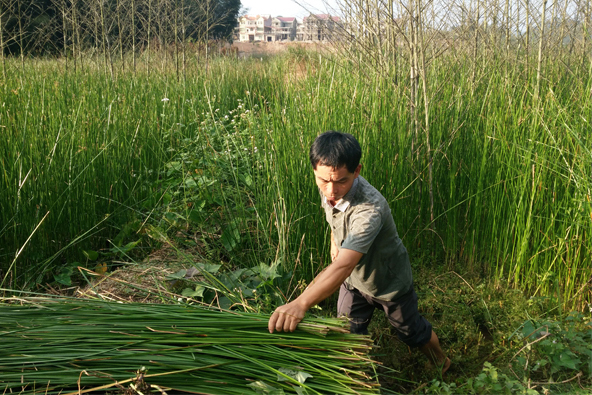 鄧麗娣的愛人檢查織好的貢席質量。 陳莉莉 攝 看著已經織好的貢席,記者一眼就能看出貢席的鎖邊工藝區別于一般的草席,特殊的原草手工鎖邊方式保證了席子不易松散,牢牢地咬住了每一根席草。從外觀上來看,貢席采用的是特殊的原料莞蒲草都對半剖開后,再由手工編織更細密結實,而普通席草沒有剖開,機械直接編織導致成品稀疏。此外,鄧麗娣拿出柜子的一團線球,她告訴記者,她織的貢席里面都是用四根纖維麻繩作為牽引,使得席子結實不易變形,同時也讓席子變得厚實,可普通的草席僅僅是用單根化纖線做牽引線而已。 “目前市面上買的草席基本都是機器編制的,漂亮是漂亮,但做工再好,也難以達到‘站立不倒,滴水不漏’的說法……”據當地村民介紹,這個草席更神奇的是有很多保健功效,睡在草席上不患風濕,當嚴冬臘月睡草席,可以不用床墊,赤膊睡在上,很快就能暖和起來,如在炎熱的夏天,睡在上面有一股清涼的氣味撲鼻而來。 據了解,編織貢川草席的席草——莞蒲草,對土壤的要求特別高,需種植在特有的沼澤山壟田里,田里常年要有山泉水流動,保證土壤的濕度,長出的莞蒲草纖維長,柔韌性強,不易斷裂。 技藝相傳 巧手編織幸福生活