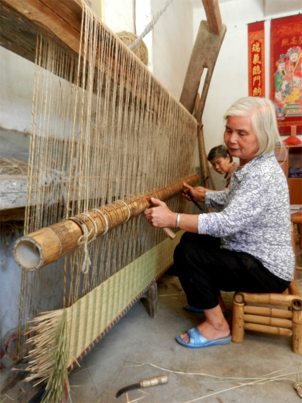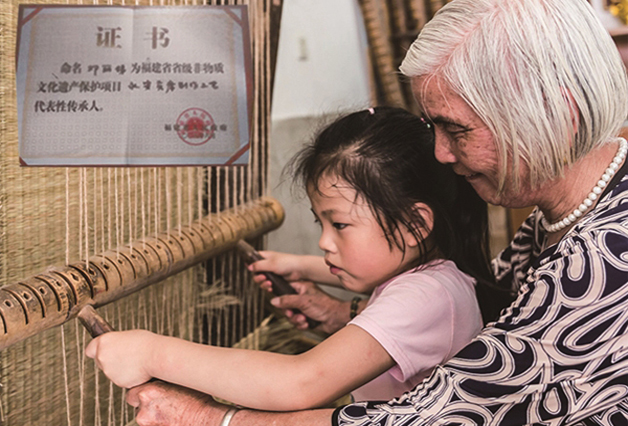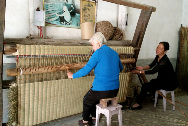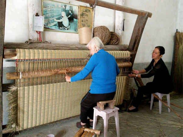 鄧麗娣與兒媳搭配編織貢席。 受訪者供圖 小時候,家里人工力量不夠,鄧麗娣慢慢地開始與奶奶搭檔,學習如何打制貢席。18歲那年,鄧麗娣嫁了人,她便與丈夫搭檔打制貢席;兒子娶媳婦后,又和兒媳一起做。這一做,就是一輩子。直到現在,鄧麗娣還常在編席機前和兒媳配合打制席子。 回憶起和婆婆一起打制草席的時光,兒媳楊秀春說:“打制草席就是一樁辛苦活!我們一起走過了多少個日日夜夜。記得那時是好幾個幼兒園同時找上門來向我們定制給學生的貢席,大大小小算起來有600余床!那段時間算是全家總動員啦!“說完便哈哈大笑起來。 楊秀春告訴記者,因為貢席質量優、具有極高的使用價值,很多人買過后都會繼續介紹客人來定制。訂單暴增的那段時間,凌晨兩三點,空中還掛著半輪彎月,婆婆就把自己喚醒做席。一天十幾個鐘頭,幾乎沒有停歇,到晚上十點多好不容易織好兩條席,還得準備第二天做席的材料。分捆、篩選、分級……必須把所有材料準備好后,她們才能安心入睡。也正是這些席子,把一家人緊緊地“捆綁”在一起,日子過得充實又幸福。 政府搭臺 非遺之花重煥生機