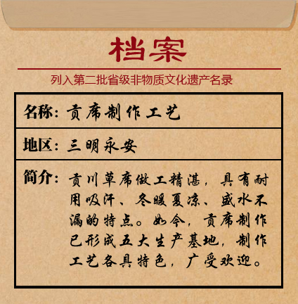 貢川草席聞名遐邇,制作工藝歷史悠久。早在宋代,貢川草席就作為貢品進獻皇宮,貢席的稱號由此傳開。明代中期,貢席更是暢銷八閩、廣受歡迎。
