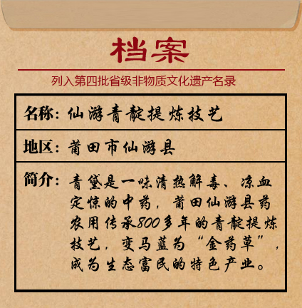 在莆田市仙游縣書峰鄉(xiāng),當(dāng)?shù)厮庌r(nóng)用已經(jīng)傳承了800多年的傳統(tǒng)手工藝——仙游青靛提煉技藝,變馬藍(lán)為“金藥草”,演繹著“青出于藍(lán),而勝于藍(lán)”的傳奇。