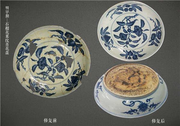 唐潔修復瓷器。受訪者供圖 唐潔說,她可根據器物種類、破損程度,及客戶的個性化需求,提供不同修復方案,包括金繕修復、考古修復、還原修復等等。 “我們平常修復一件器物的周期快的話三、五個月,慢的話二、三年都是常有的事,文物修復更多的是與器物的對話、與千百年前創造這件器物的作者進行對話:了解器物的背景文化、器型特征,了解作者的創作思路,如何修胎,如何運筆,要無限地復原前人的創作,恢復器物最完整最華麗的狀態與歷史文化傳播的價值。”令唐潔印象深刻的是之前修復的一件清代?乾隆時期的青花黃帝盤,一共碎了7片還有不同的殘缺,由于釉色豐富,畫工復雜修復周期漫長,為了達到極致的還原,在紋飾修復的時候反反復復返工了不下百次,最后共耗費了2年多的時間才修復完成。 “拿到這些有裂痕的老物件,首先要進行粘合。修復要完成一系列補胎灰、補漆灰、找平、打磨等工作。每一步都需要極強的耐心和細心。對于一些允許創作的物件,而后要根據器物種類、器形等各方面進行進一步修飾,創作全新的圖案,給老物件穿上一件新的外衣。”談起修復技藝,唐潔頗有自信和心得。 在她看來,修復技藝需要的是漆畫技藝和壽山石雕刻等技法的跨界融合,這一點從她大學專業學的是動畫影視專業得到了印證。此外,她還師承文物修復專家張兆祥老師(《中國瓷器三千年》《中國文物大典2》編撰者)、壽山石雕刻大師劉北山老師。