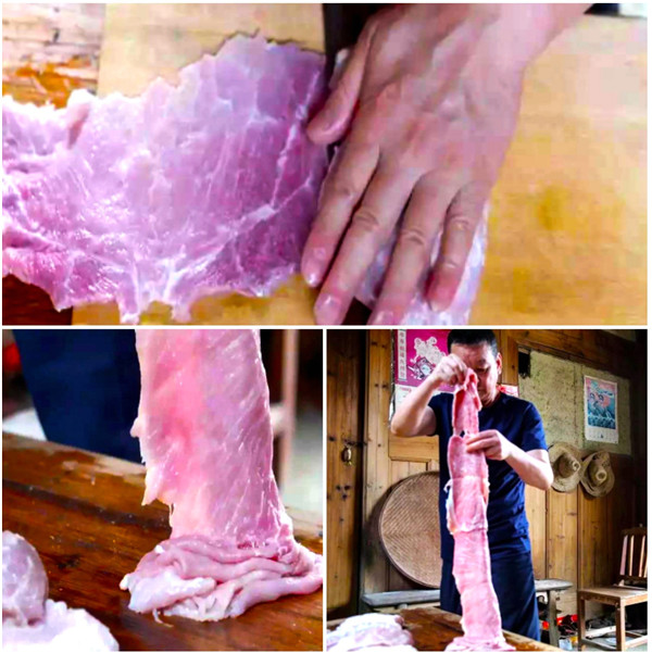 明溪肉脯干制作技藝省級非遺代表性傳承人羅顯光顯示刀工。 林銘水 攝 2008年,明溪肉脯干制作工藝被評為福建省省級非物質文化遺產保護項目。要說最知名的明溪肉脯干,當屬“榮興”肉脯干,它由羅林希于1939創建,改革開放后,一直由羅林希孫子羅顯光繼承發展。榮興肉脯干榮獲商務部中華老字號認定商標 、國家地理標志保護產品等。羅顯光是目前福建省人民政府認定的明溪肉脯干制作工藝非遺代表性傳承人。 傳承古法 薄如紙的肉片回味悠長 這種具有獨特風味的小吃,最重要的就是選材。羅顯光介紹,制作肉脯干的原料選用的都是土生土長的上等豬腿肉,腿肉上薄薄的脂肪和肉筋都全部剔除。“細節的地方沒有處理好,烘烤起來會滴油,出來的肉脯干有肉筋,影響口感。”接下來就是削片,這個工序,也是制作肉脯干需要傳承的技藝之一。用一尺多長的鋼刀將后腿肉橫切成一米多長、兩毫米厚的肉片,肉的紋理清晰可見,用鋒利的剝刀逐層切剝,所剝之肉,其薄如紙。