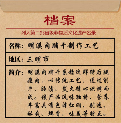 明溪肉脯干:700多年傳承工藝(視頻來源:明溪縣融媒體中心) 2019年12月底,旅居匈牙利的明溪人黃健忠回國,回家第一件事就約了親朋好友一起喝茶配肉脯干。“出國在外,就想念這口家鄉味!”吃著肉脯干,聊著家鄉事,此刻的黃健忠覺得在外所有的辛苦都是值得的。 這種讓黃健忠念念不忘的美食,已經流傳了700多年。南宋末年(1277年)文天祥在南劍州募兵后,欲往汀州,路經明溪鎮。當時,明溪不少百姓參加勤王之師,隊伍開拔前,親友總要送些禮物給即將遠行的親人。有人受給老師送“束修”(肉干)的啟發,將豬瘦肉切成薄片,用天然名貴香料腌制,精烤成肉脯干送給親人,以使行伍攜帶,隨時可食用。此后,明溪肉脯干便聲名遠揚,廣為流傳。