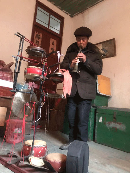 虞東生演示“絕活”。劉建飛攝 “我試著把大鑼、小鑼、大鼓、小鼓、叫鑼、鈸和板等樂器焊接到一套道具上,自已做‘獨門樂器’。像這樣,一邊用腳踩擊大鑼、小鑼、大鼓、小鼓、叫鑼、鈸和板,一邊用嘴吹笛子或嗩吶。”虞東生一邊說,一邊擺弄著他的“獨門樂器”。 “工具做出來后,練就 ‘絕活’還得靠自己。剛開始練的時候非常難,不是忘了手就是忘了腳,總是配合不好。但是我堅持每天都練,練到腳打抖,抬腳都難。”就這樣足足練了四個月,虞東生的“絕活”終于練成了。他一人能攬下6個人的活,同時演奏8 種樂器,成了“一心多用”的器樂手。中央、省、市多家媒體都曾對他這一絕活進行報道。 虞東生還有另一個 “絕活”——飾演《天官賜福》里的天官。每當鄉村開新臺,這個節目是必上的。節目里只有天官一人主唱,其他十三個演員圍著天官轉。能扮演天官的都是德高望重的老藝人,除現年90歲的老前輩劉明外,村里只有虞東生能演天官。“這么多年,只有我會在開新臺時表演。”說到此事,虞老頗為自豪。 潛心譯舊譜 教徒弟傳承文化