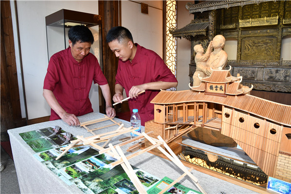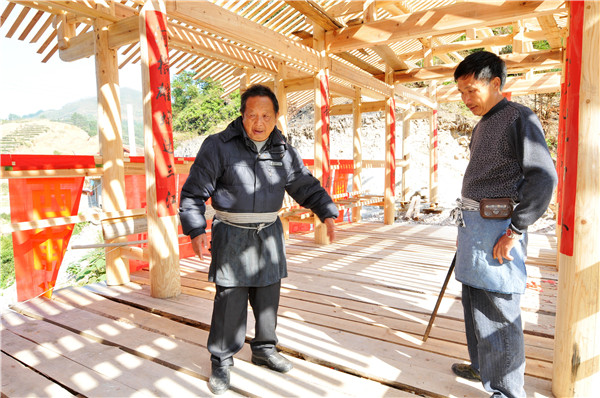 鄭多金(左)與弟弟鄭多雄在飛龍橋交流建橋經驗。龔健 攝 鄭多雄原本主業是一名石匠,對造木拱廊橋一竅不通。跟鄭多金學造木拱廊橋也是機緣巧合。2002年,鄭多雄跟鄭多金學習遷建芹洋鄉張坑、長瀨溪兩座木拱廊橋回來后,他找來木工工具,每天花上八九個小時練習砍、劈、削、彈等基本功,熟記哥哥傳授的建橋工藝口訣。等基本功熟練后,他上山找來適合的木料,在哥哥的指導下搭建木拱廊橋模型。 在別人看來,完成這一系列工序實在是枯燥無味,而鄭多雄卻持之以恒,樂此不疲。 “搭建一座木拱廊橋,需要建橋臺、測水平、立水柱架、支天門車、造拱架、上剪刀苗、橋板苗與馬腿、架橋屋等,每道工序缺一不可。剛開始每天花八九個小時制作。我印象最深的是,第一次建木拱廊橋模型,建了20來天仍然不成功。我堅持到了一個月后才建好第一個木拱廊橋模型。為了熟練掌握技巧,我后來又多次修建了不同尺寸的模型。”鄭多雄回憶道,經過數年的打磨鍛煉,他的木拱廊橋營造技藝也漸漸小有名氣。 “大家生活水平也慢慢提高了,來找我做木工的人也絡繹不絕。”鄭多雄說,不管是修繕老木屋還是節慶所用的木質道具,很多人找他做。 “大家對我的手藝還比較滿意。”鄭多雄樂欣慰地說,靠著一直以來堅守的這門傳統手藝,他蓋起了全家人遮風避雨的小樓,生兒育女。 數十年建橋保持初心與匠心 其實,從建造石橋到木拱廊橋,這一路走來,鄭多雄從少年走到了花甲之齡,近到鄉里鄰居,遠到閩浙交接縣市區,都有他的足跡。 “每個人的內心都像一塊木頭,想變點兒樣子,須得先用斧頭砍一砍,再用錐子鑿一鑿,然后用刨子刨個光,最后用砂紙打光滑。”鄭多雄說,徐、鄭世家祖傳主墨廊橋造詣至今已經第八代,“我們既然做,就有義務有責任把它做好,做出名氣,一代代傳承下去。”