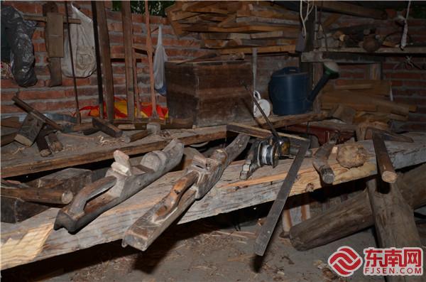鄭多雄與兒子鄭輝明在家中交流木拱廊橋建造技藝。東南網記者 陳翊群 攝 在父親的言傳身教影響下,如今鄭多雄的兒子鄭輝民也加入了木工匠人的隊伍。 “現在需要手工家具的很少嘍,不過跟著我的這些‘老家伙’們一直沒變。”在鄭多雄的工作室,記者看到了老人口中陪伴他多年的“老家伙”:測繪用的魯班尺、墨斗、規,切割用的斧頭、橘子、鑿子、鏟子,打磨用的刨子、鉆、銼……在散落的木屑間,它們被整齊地碼放著。